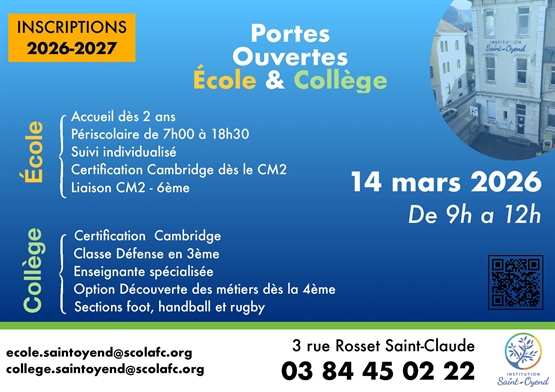 Dans la tradition de l'Enseignement Catholique, notre établissement est ouvert à tous et s'emploie à accueillir chaque élève comme une personne unique. L'équipe éducative de l'Instition Saint Oyend travaille en ce sens afin que chaque jeune puisse trouver des adultes attentifs, respectueux et engagés dans un climat de partage et d'esprit de famille.